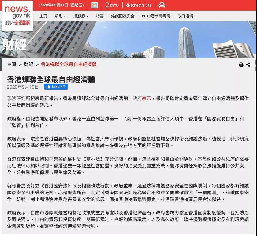“ 加拿大菲沙研究所(Fraser Institute)2020年9月10日發(fā)表《世界經(jīng)濟(jì)自由度2020年度報(bào)告》,再次將香港評(píng)為全球最自由的經(jīng)濟(jì)體。”