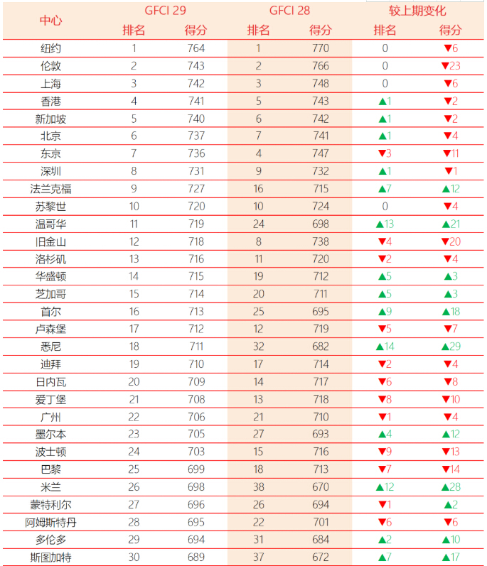 全球前十大金融中心排名依次為:紐約、倫敦、上海、香港、新加坡、北京、東京、深圳、法蘭克福、蘇黎世。